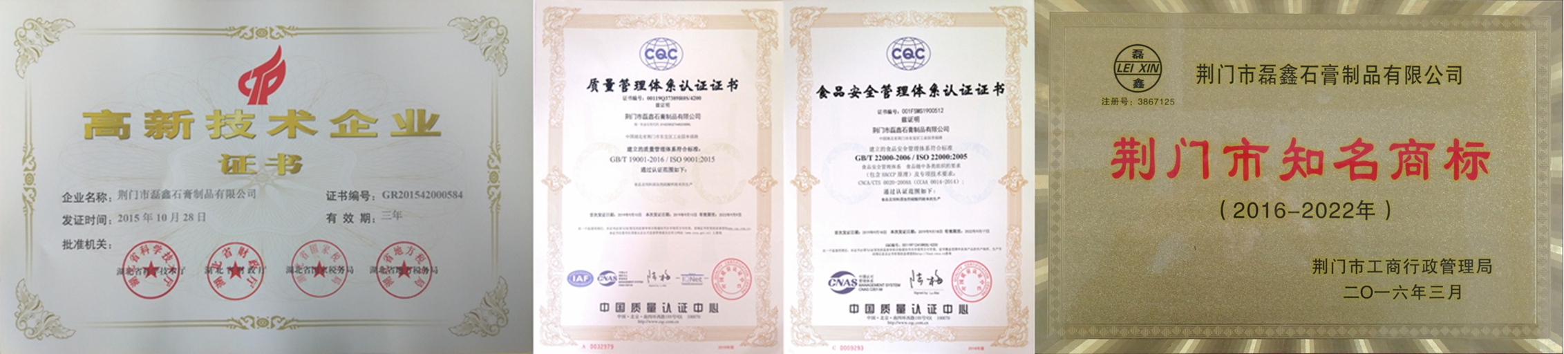 國家高新技術企業!湖北省專精特新中小企業!湖北省支柱產業細分領域隱形冠軍培育企業!湖北省守合同重信用企業!湖北省兩化融合示范企業!荊門市知名商標!中國高純、高白、高亮、超細硫酸鈣(石膏)生產基地!中國取得《食品生產許可證》的食品添加劑硫酸鈣(石膏)供應商!中國取得《飼料添加劑生產許可證》和《產品批準文號》硫酸鈣供應商!中國取得《出口飼料生產、加工、存放企業檢驗檢疫注冊登記證》飼料添加劑硫酸鈣供應商!通過ISO9001國際質量管理體系認證!通過ISO22000國際食品安全管理體系認證!通過HALAL國際清真認證!通過KOSHER猶太認證! 荊門市磊鑫石膏制品有限公司成立于2002年,位于石膏資源富集的湖北省荊門市東寶區工業園幸福路,占地27000余平方米,是一家在業內享有盛譽的集石膏、石膏粉和硫酸鈣制品研發、生產、銷售于一體的高新技術企業。公司擁有 “磊鑫”、“杰普生”、“凱氏蘇特”等5個國家注冊商標,2個發明專利,18個實用新型專利,50余篇自有技術應用研究,36篇權威期刊發表技術論文。主要產品有:醫藥級硫酸鈣、食品級硫酸鈣、飼料添加劑硫酸鈣、人造石透明填充粉,凱色粉、涂料及化妝品功能性填料和特級半水纖膏粉、混合石膏粉、模型石膏粉,建筑石膏粉等九大系列50余種產品。公司享有自營進出口權,客戶遍布全世界,是多家公司、集團和世界500強企業的優秀供應商!產品遠銷到韓國、日本、俄羅斯、中國臺灣、東南亞、歐美、中東、非洲等國家和地區。公司緊靠207國道,焦柳鐵路穿境而過,距漢江碼頭50公里,長江沙市港90公里。交通運輸便利,確保及時供貨?!按脩魹樯系壅\信為本,視質量為生命持之以恒!”是我們的企業宗旨,與我們合作是您明智的選擇,共謀發展是我們共同的目標!歡迎垂詢,歡迎惠顧! Your Trusted Source For Food-Grade Calcium Sulfate!——做全球更好的食品級硫酸鈣(石膏)供應商!          ——CGC·磊鑫石膏